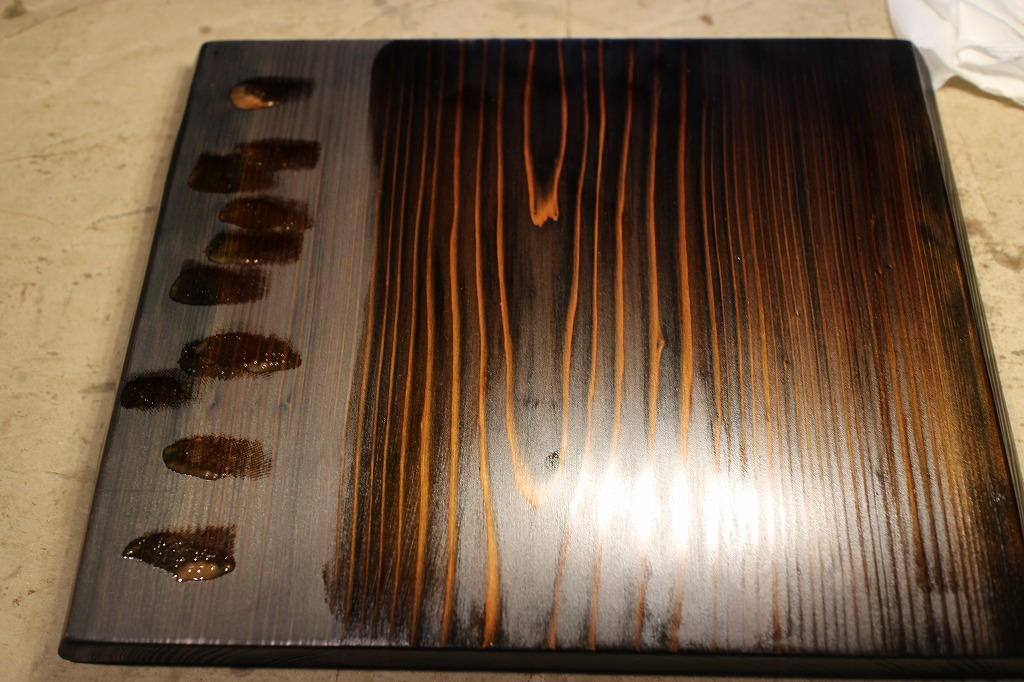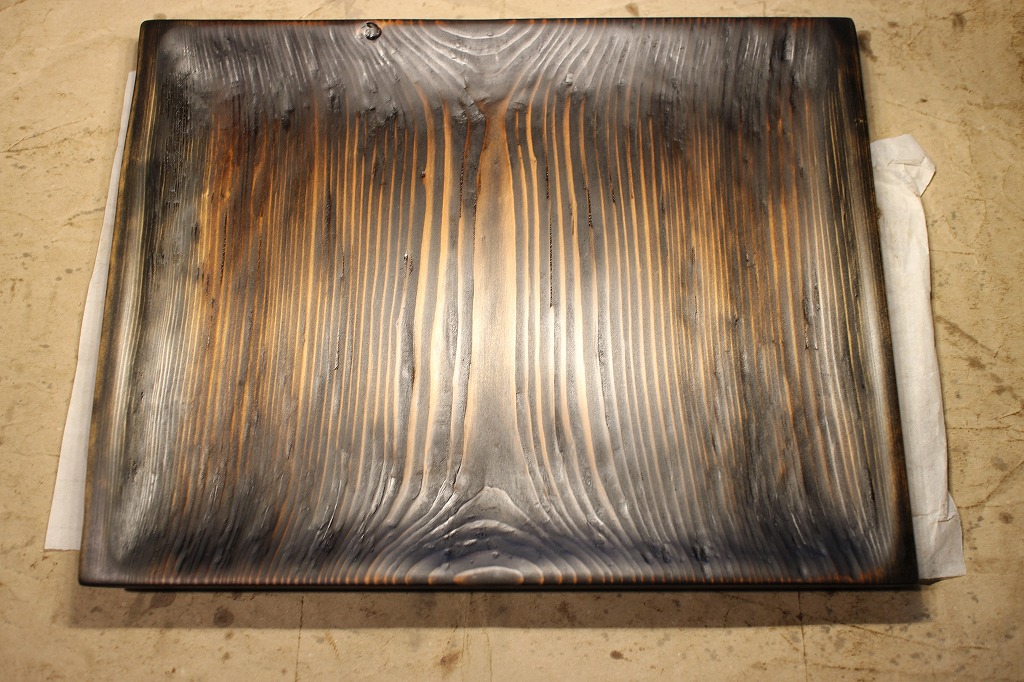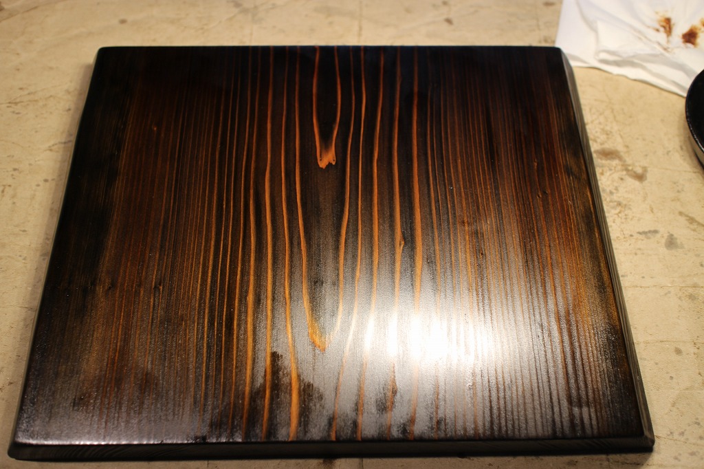 ①杉材の横長皿は木地固めが終わって塗りに入っています。画像は上塗りの2回目、上次