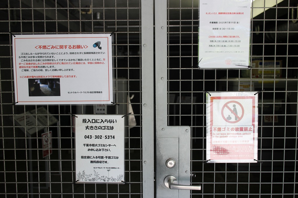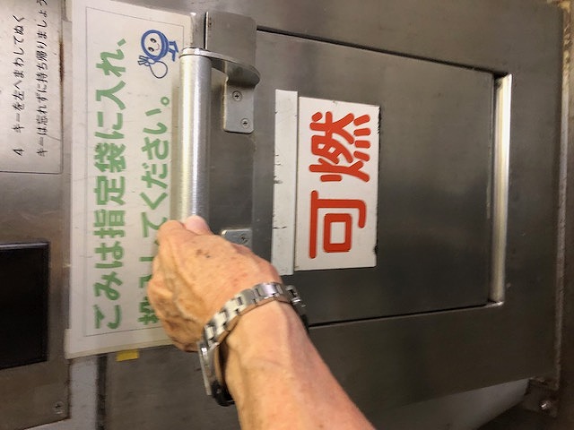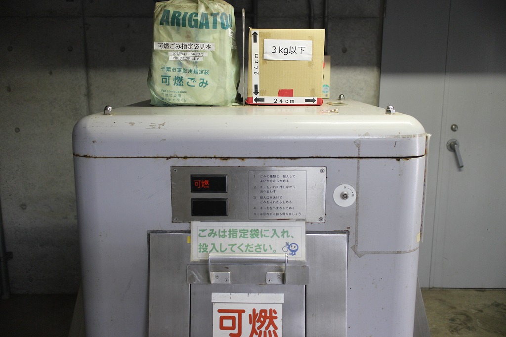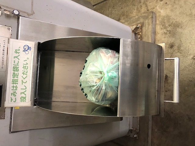 ③ベイタウンには、各パティオスごとにゴミの投函口があります。可燃ゴミ・不燃ゴミごとに地下の通路を通ってごみ処理センターへ集められます。ゴミ袋は10リットル袋に限定、重さは可燃ゴミは3kg、不燃ゴミは1.5kgまで。この決め事を護らないとこのシステム全体が止まります。