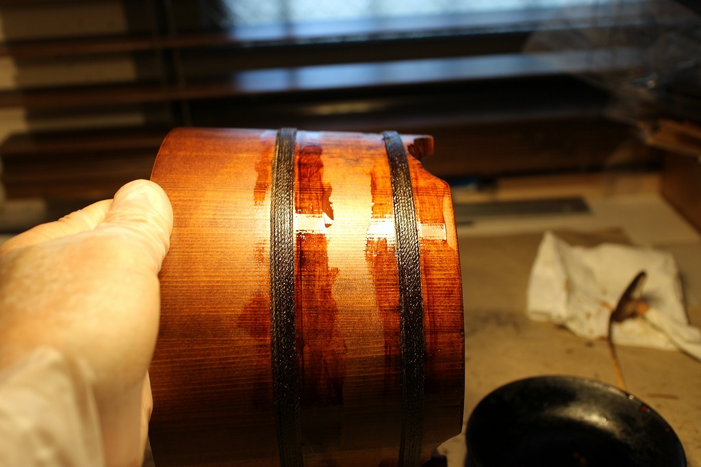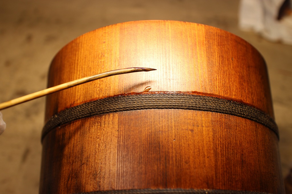 太いタコ糸で胴周りを縛り付けてあります。そのタコ糸に漆を補充塗りするのと全体にもう一度