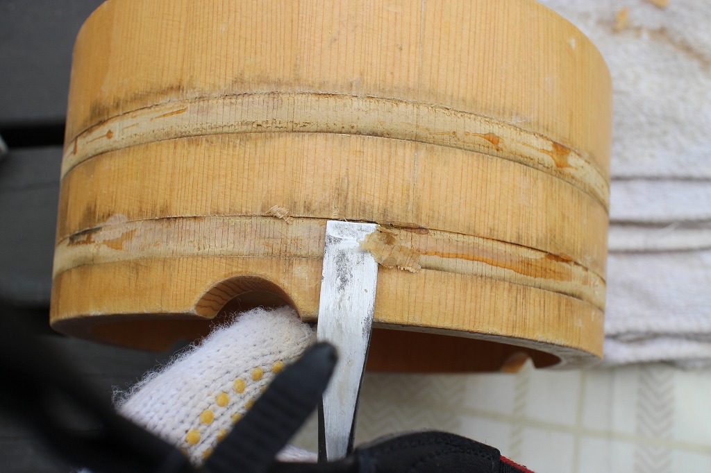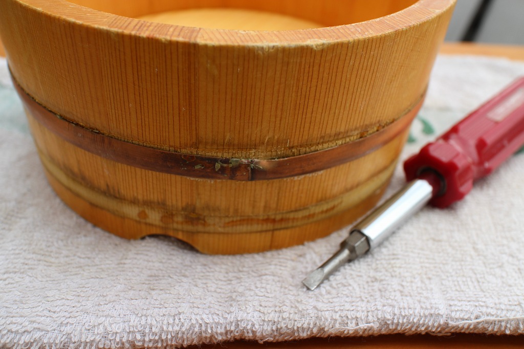 まず胴タガを外します。3個のうちの一つにゆるみ止めの接着剤が施してありました。その位置に胴タガの代わりにタコ糸を巻く都合があるので接着剤を取り除きます。