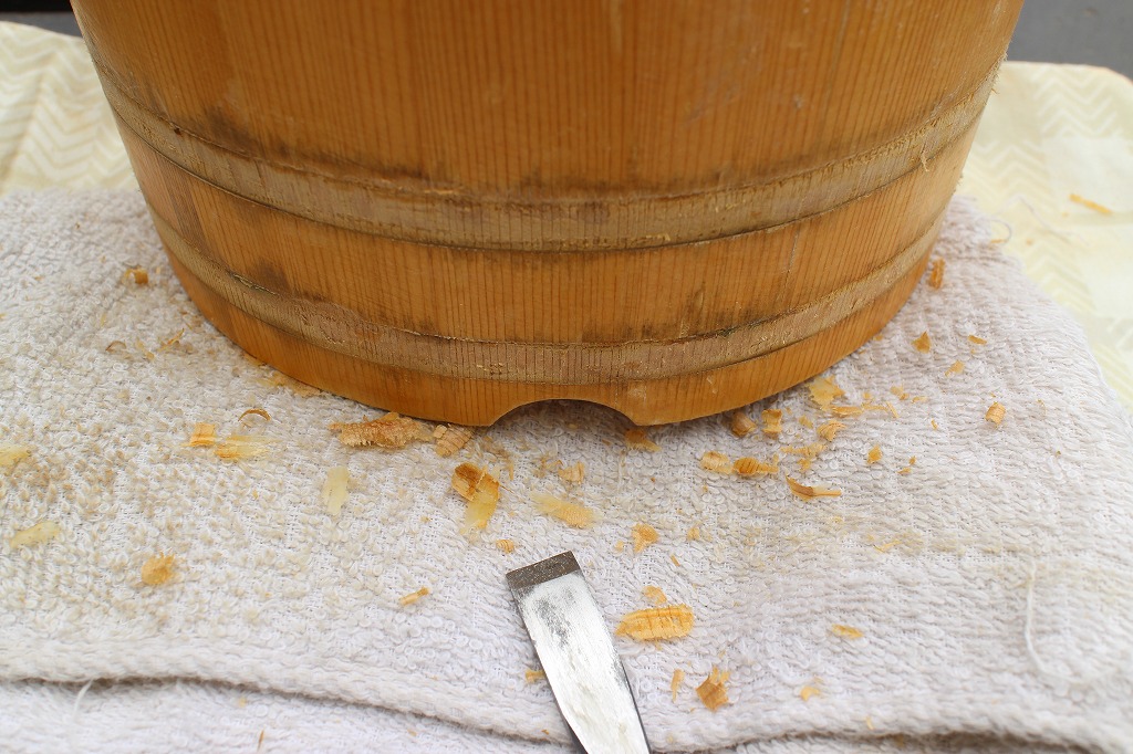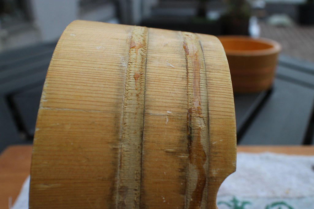 中古厨房機器屋さんテンポスで一人用の釜揚げうどん桶らしき物を見つけたので、ダメもとでレストアーしてみようと思います。新品は上野の合羽橋問屋街でしか見たことがなく結構レアなものです。ダメもとの理由は、ウレタン塗装をしてあるのでそのままでは漆を吸い込みません。