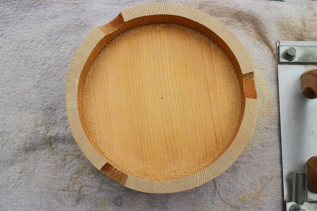 使い込んだからでしょうか側面は結構塗装が剥げています。ところが底面と内側はまだウレタン塗装が健在です。基本方針として上下面と側面に漆を塗り底面と内側はそのままでいきます。