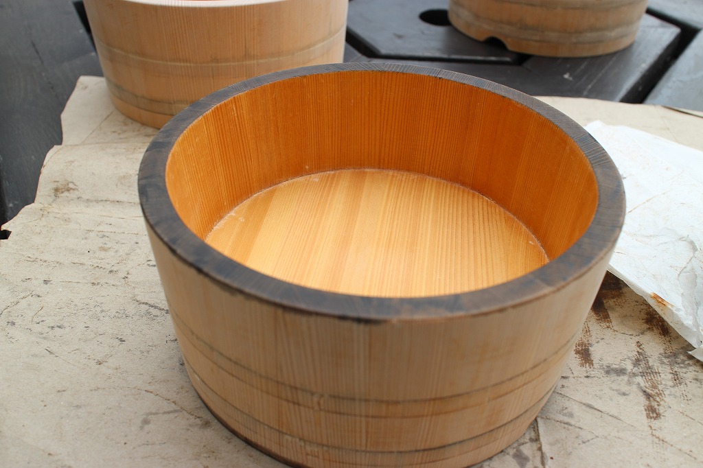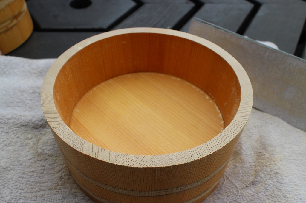 本日(7/11)は一日中曇り、おまけに北よりの風で屋外での仕事も快適。一気呵成に黒中漆による木地固めまで進めました。側面に黒の縦縞模様が出てきましたが、これはさわら材の油分です。