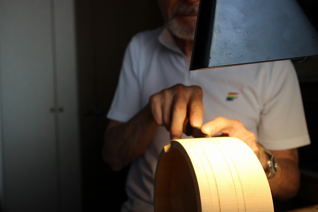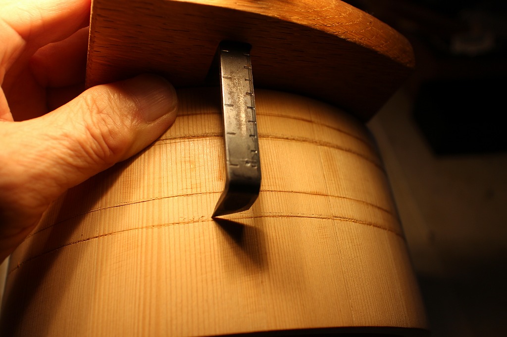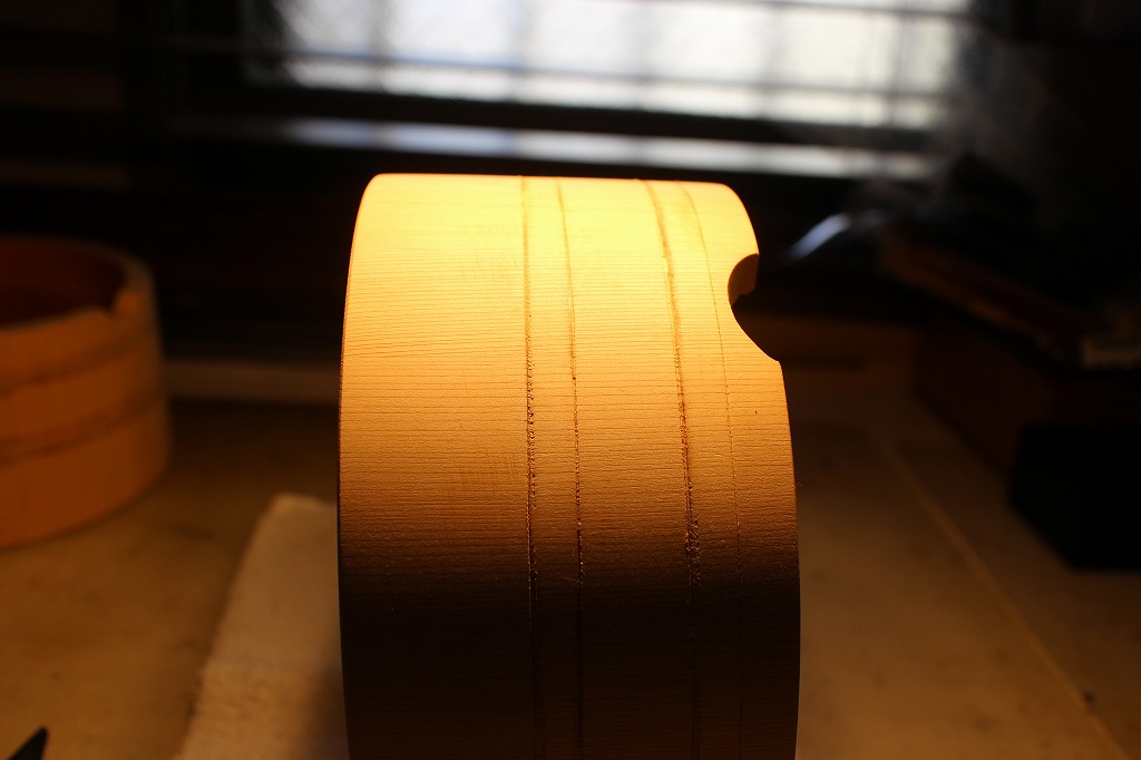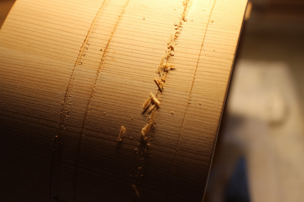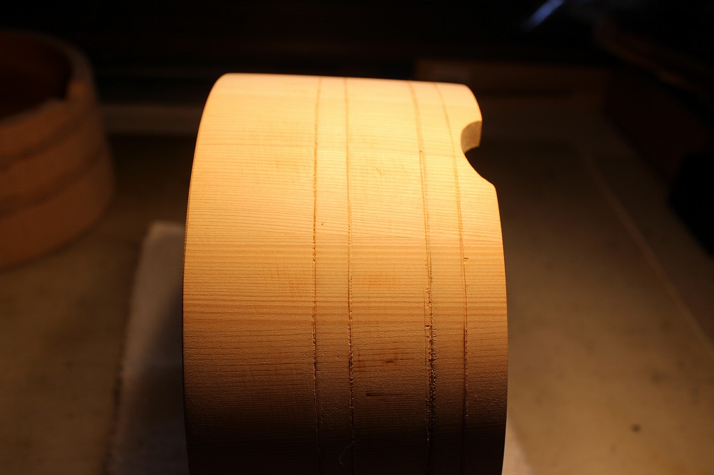 別物が漆室に入っている間にさわら材の残りの二つのオケの溝彫りをします。最初にケガキ用の