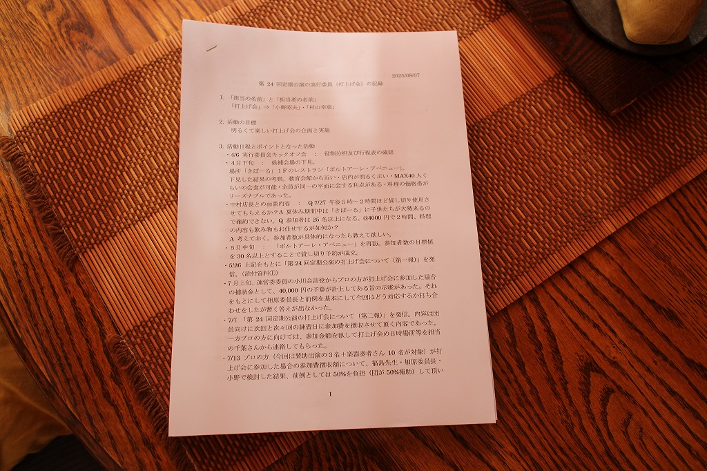 それから早くもひと月が過ぎようとしています。只今、記憶が定かなうちに記録を残そうと実行委員会の面々がそれぞれの受け持ち分担の記録を作成して、次の練習会に持ち寄ることになっています。私は、お得意の「打上げ会」が担当でした。