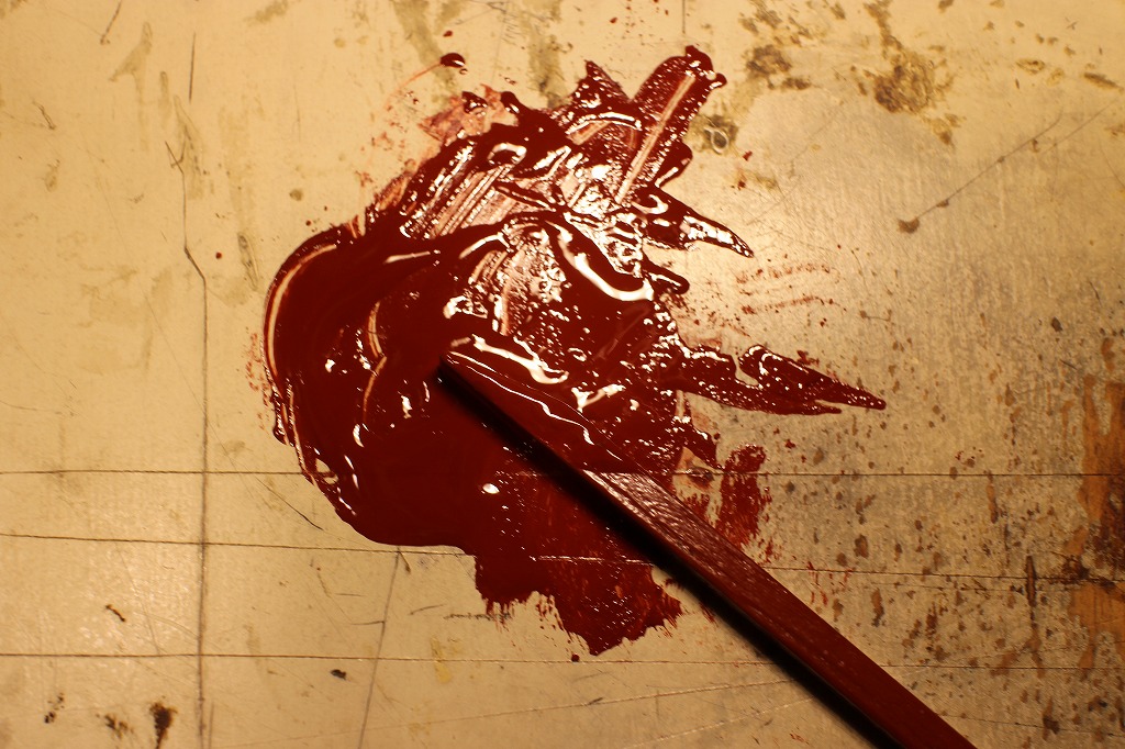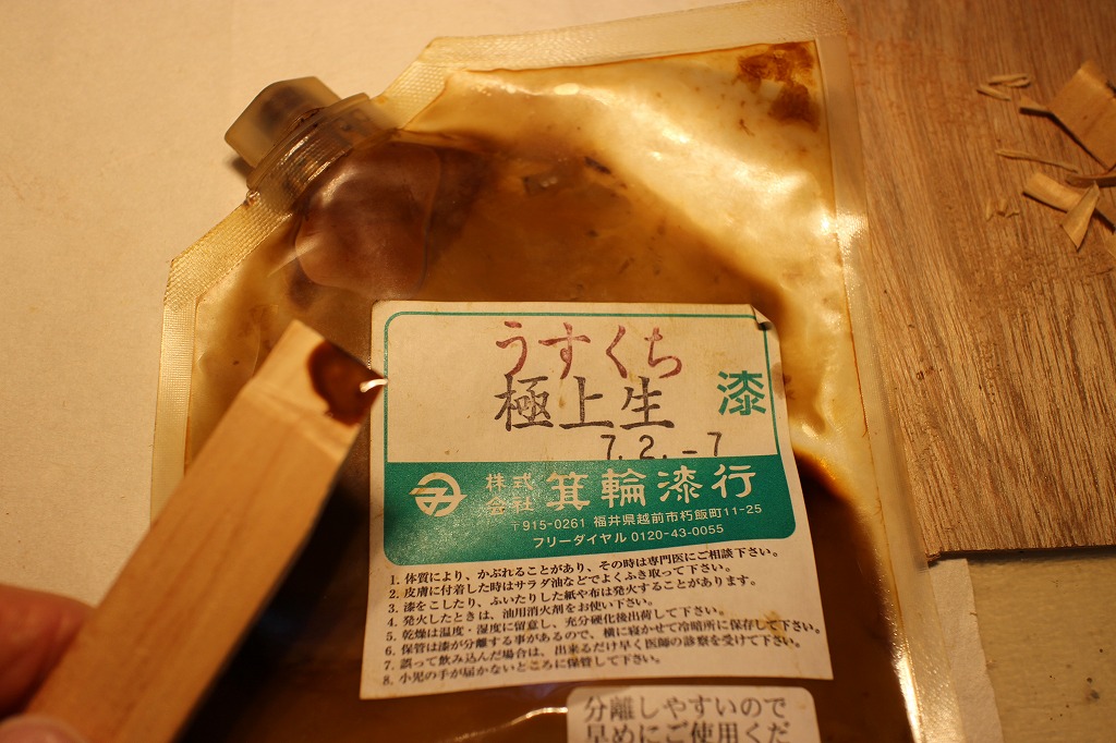 してみました。弁柄と生漆を1:1でブレンド。試し塗りの材料は檜材と漆を塗った箸置きです。