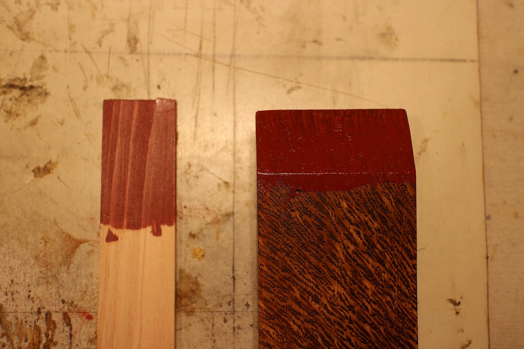 素材そのものの檜材は汚らしく、片や箸置きには奇麗に上塗りできました。こちらで行きます。