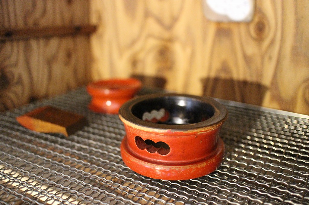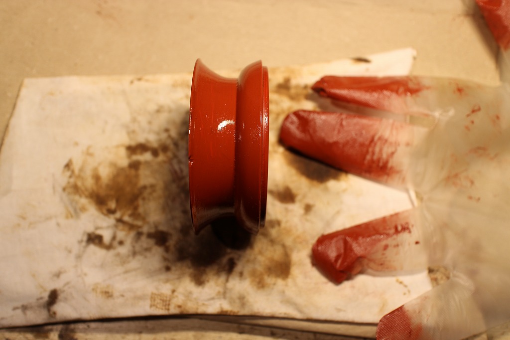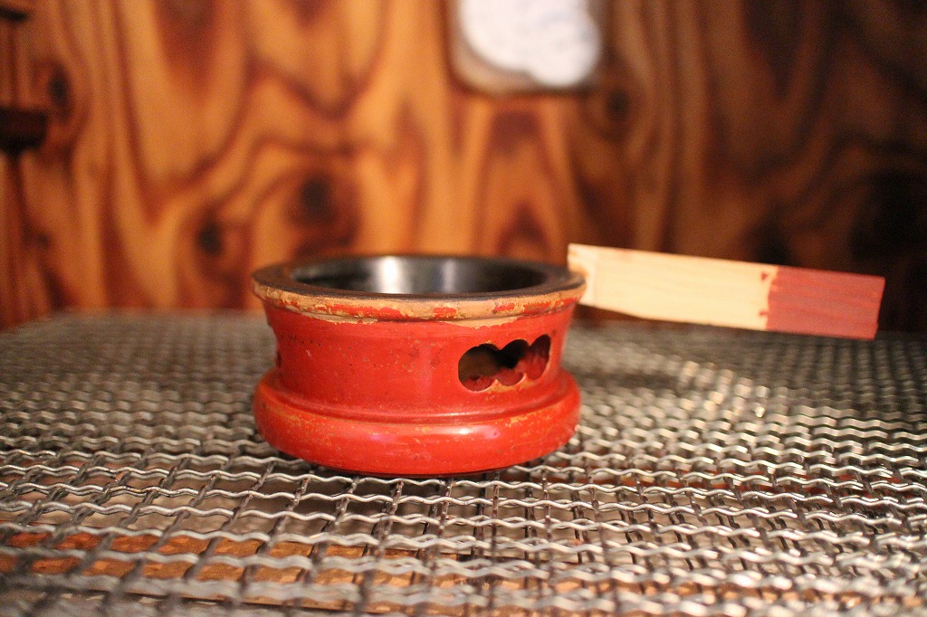 課題その①。リン台の色は朱色ではなく東洋赤(弁柄)に近いので弁柄漆を作って試し塗りを