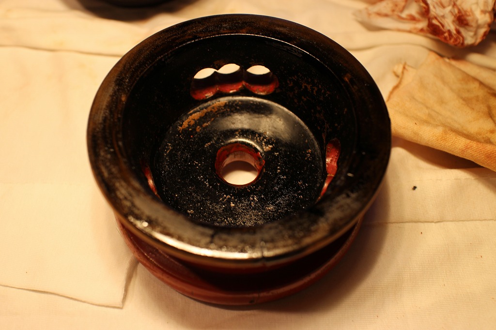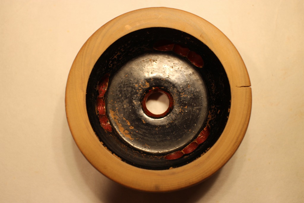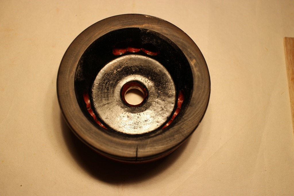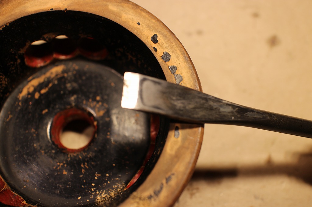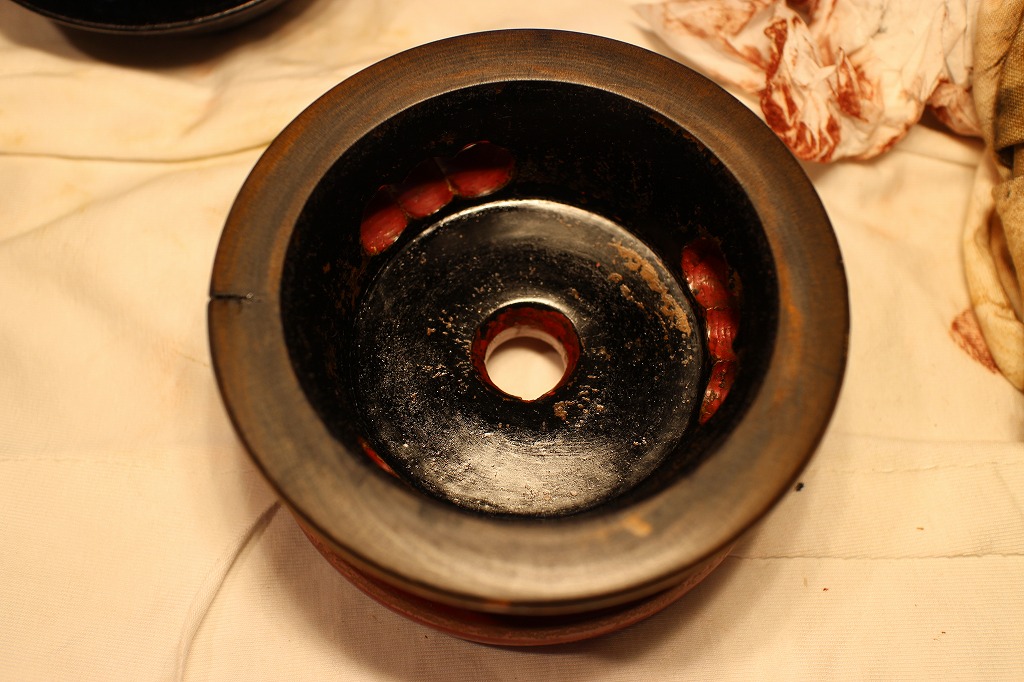 と言うことで出て来た答えは、上面はそのままとして⇒側面は傷んだ部分を整えて表面と同じ色に塗る⇒裏面は同じく傷んだ部分を整えて黒中漆で塗るです。でも正直、課題がいっぱいです。