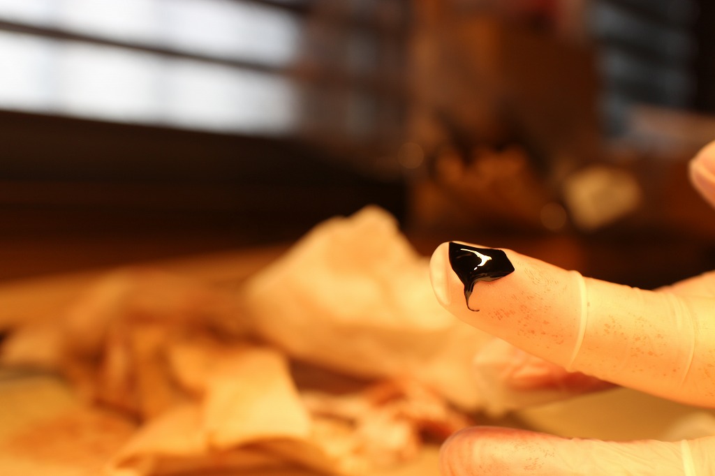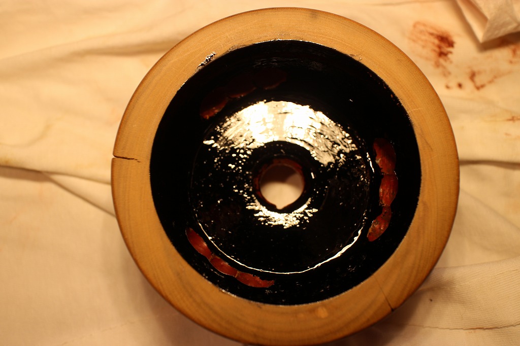 次に出来るところから、一番バッターは裏面の補修と黒中漆での一回目の拭き漆です。
