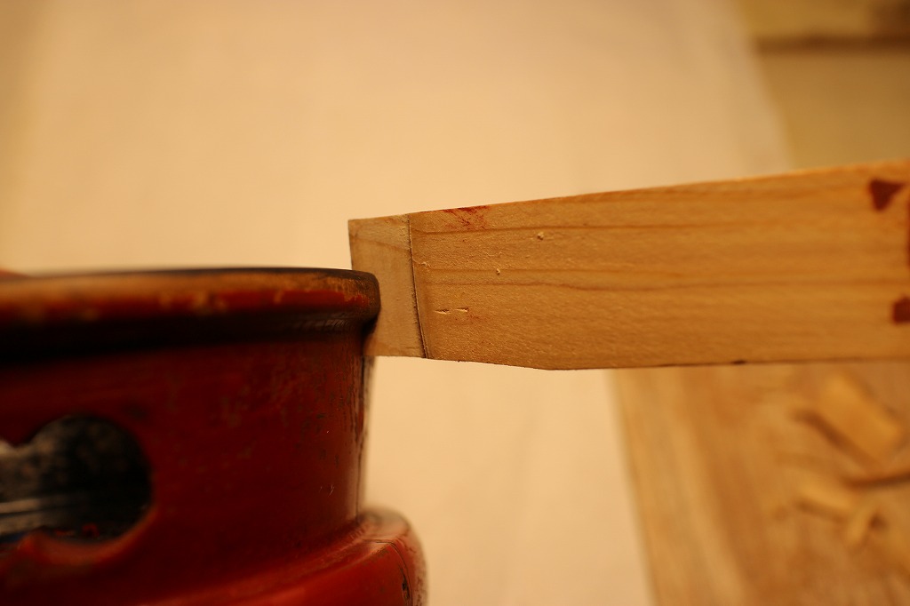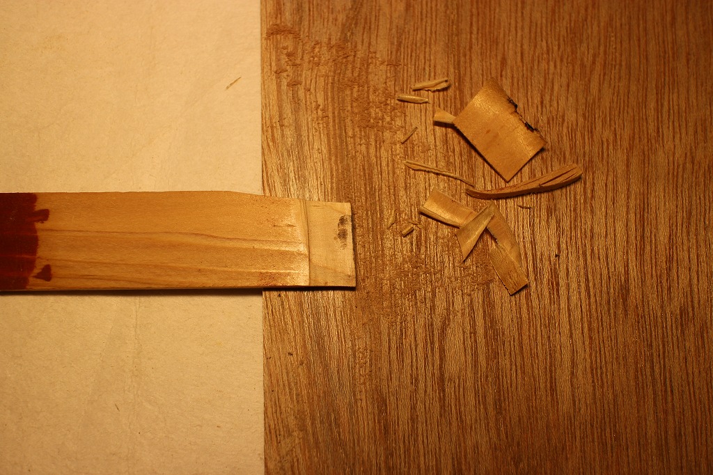 試し塗りに使った端材をテーパー状に削ってすき間に挟み込んで埋めることとしました。