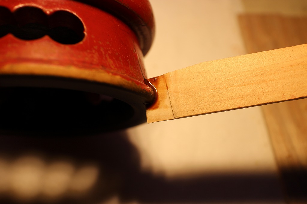 この作業の途中で、裏面のひび割れ部分に生漆を差し込んで接着剤の代わりしてみます。