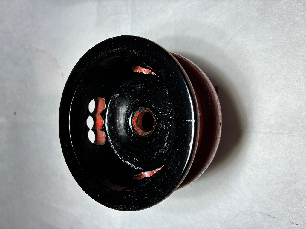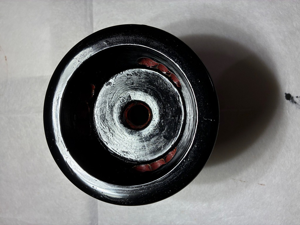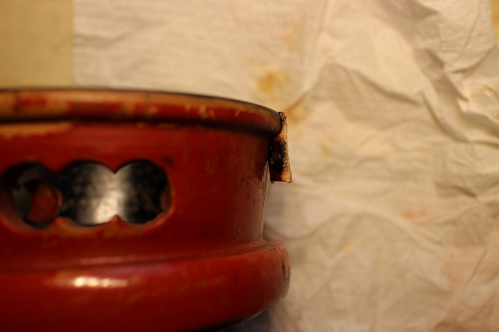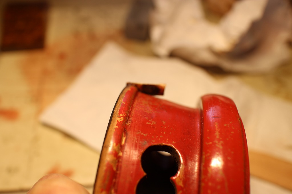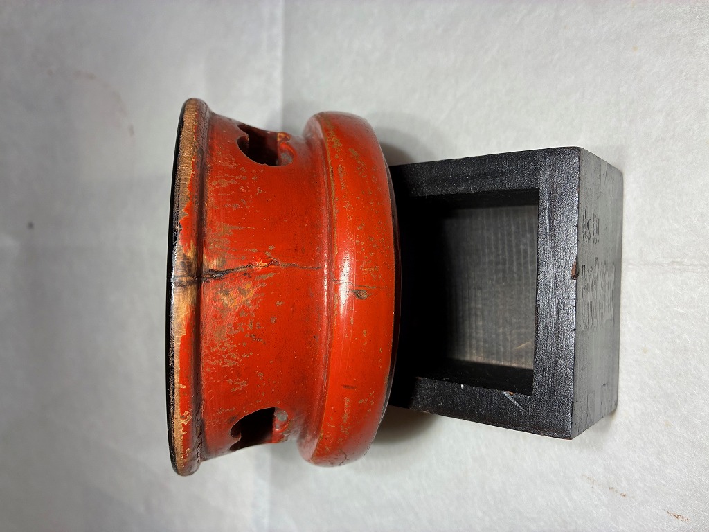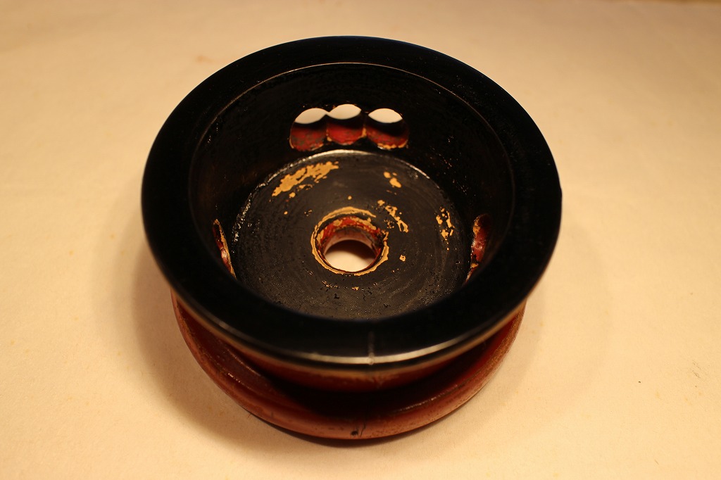 友人から預かったリン台のお化粧直しなんですがボチボチ進んでいます。前回はひび割れの補修でした。その後の工程は楔状に挟み込んだ端材を整形して裏側に黒中漆で拭き漆を施しました。