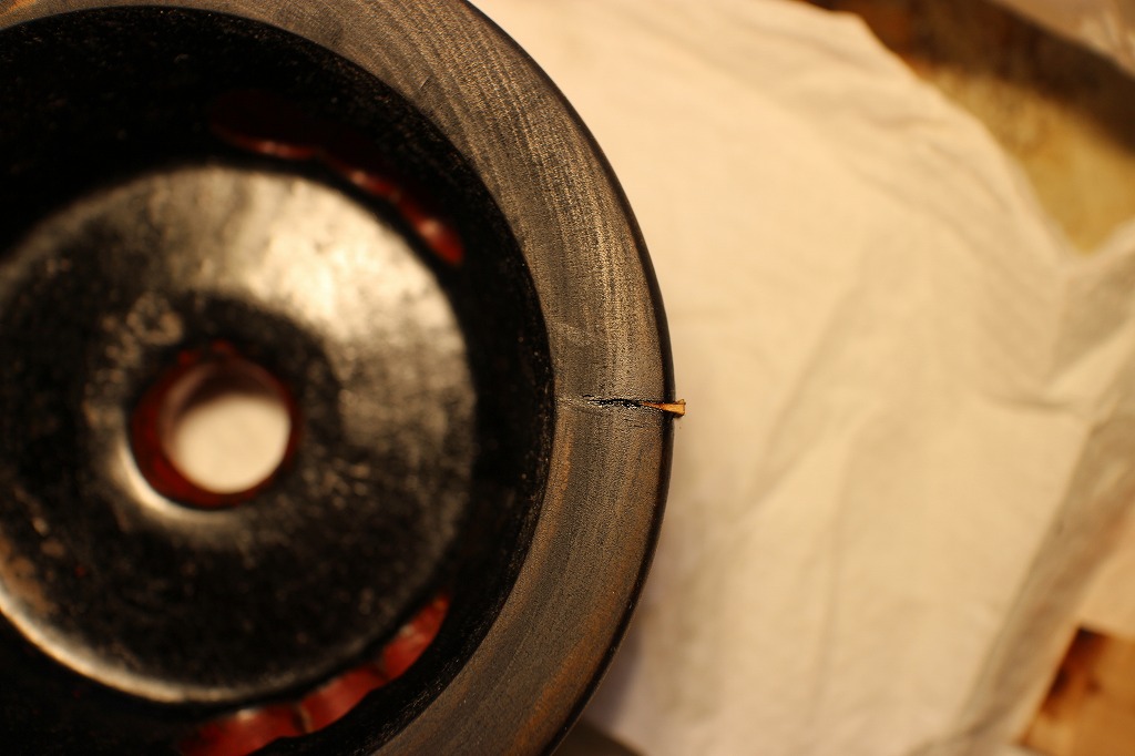 下↓は乾燥室で2晩経った後の画像です。割れを修復した部分はいいのですが、裏側の底は