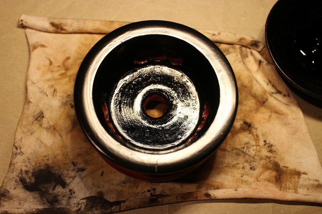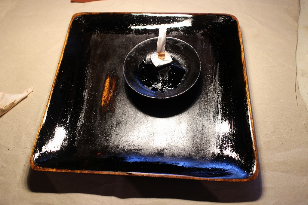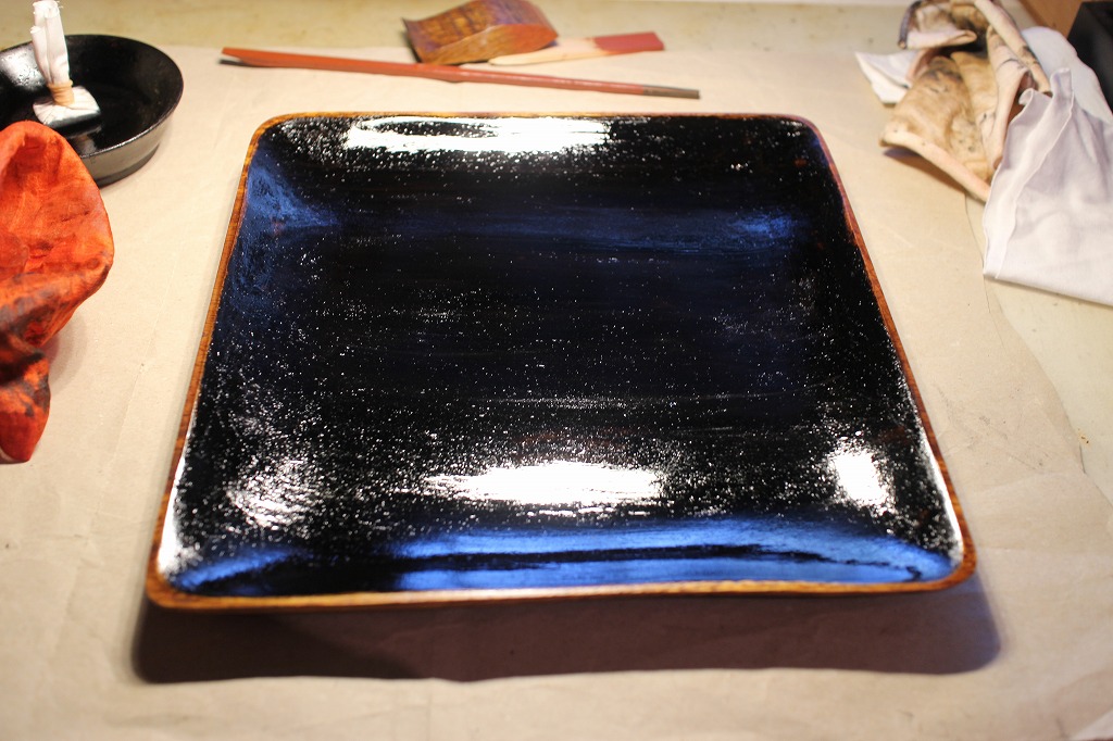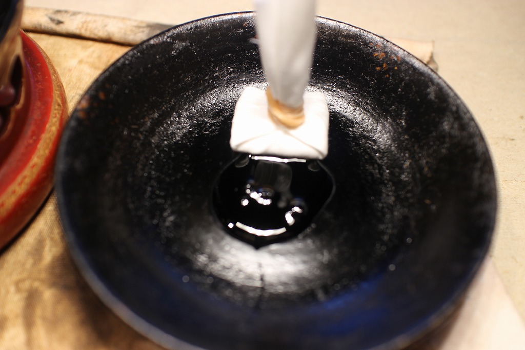 裏側の2度目の塗りです。小さなタンポを作って少量の漆を付けて塗り立てにしました。