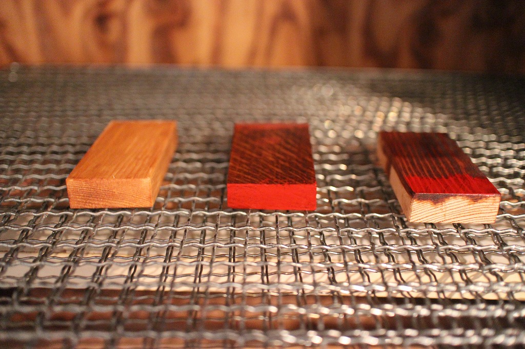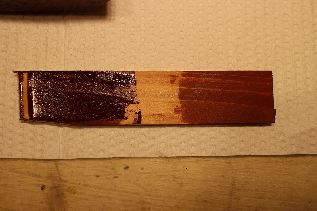 艶ありの本朱漆をテストピースに塗ったら、あれっ?弁柄漆よりも真っ黒になるのです。(左)文献で調べたら、最初は黒ずみ徐々に朱色になるとこのこと。それを信じて塗り重ねてみます。