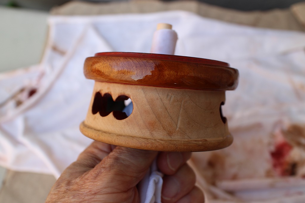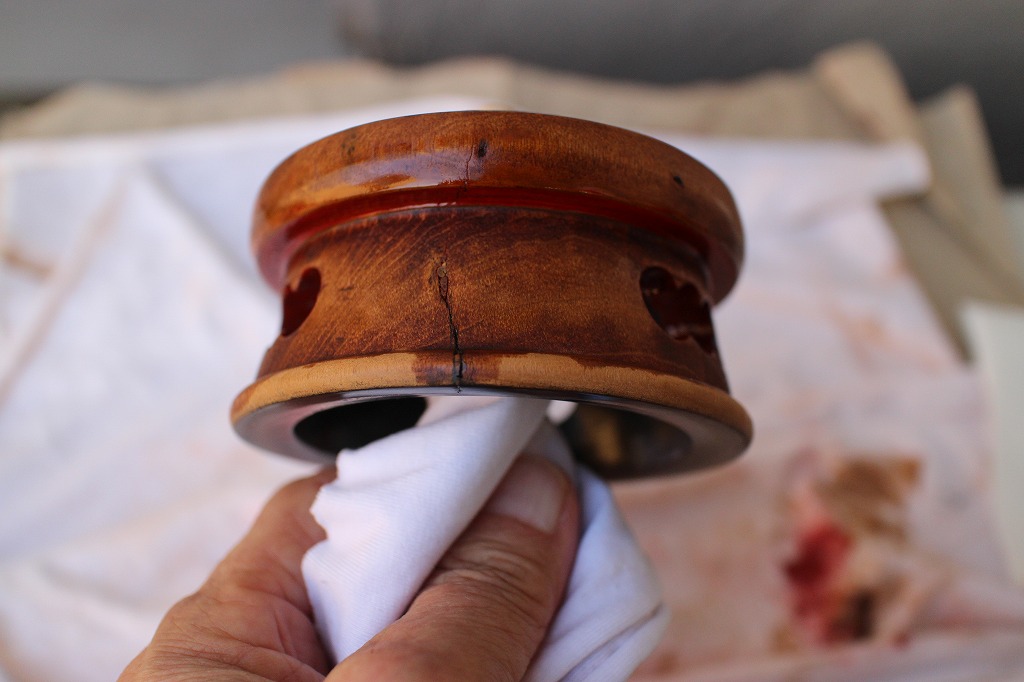 中心に空いた穴に丸棒とウエスを蒔いた支え棒を差し込み、それを軸として廻し塗りをします。