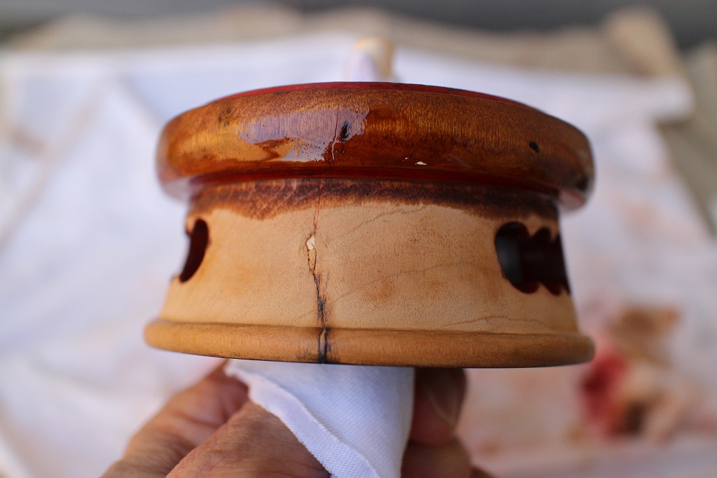 リン台のお化粧直しですが、側面の朱漆を剥がして色合わせをする段になったのです。それが大きな関門だとすぐ気が付きました。それは、朱漆を塗った経験がないものですから試験的に弁柄漆を作って試し塗りをしてみたのですが、思ったより暗い色なので一旦ストップして本道へ。