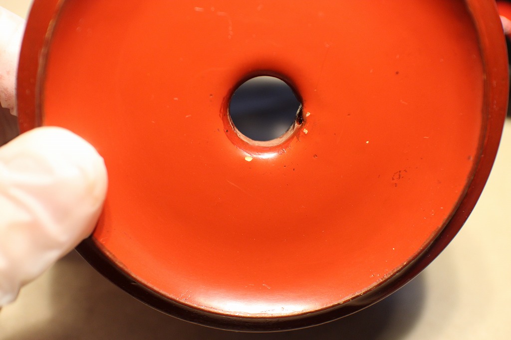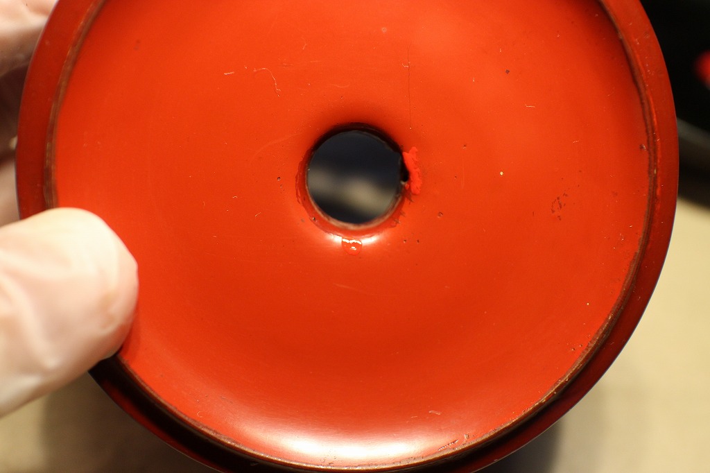 リン台のお化粧直しですが、8月のお盆を過ぎて預かってから試行錯誤しながらやっとゴールを迎えました。思ったより時間がかかったのは、朱漆を塗った経験がなかったのでリン台の元の色(たぶん4世代に渡って使われてきたのでかなり色焦せていた)に合わせるのに手間取ってしまったのです。最終的にリンの座布団が乗っていた部分を残して練り赤口色としました。