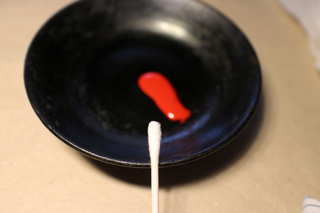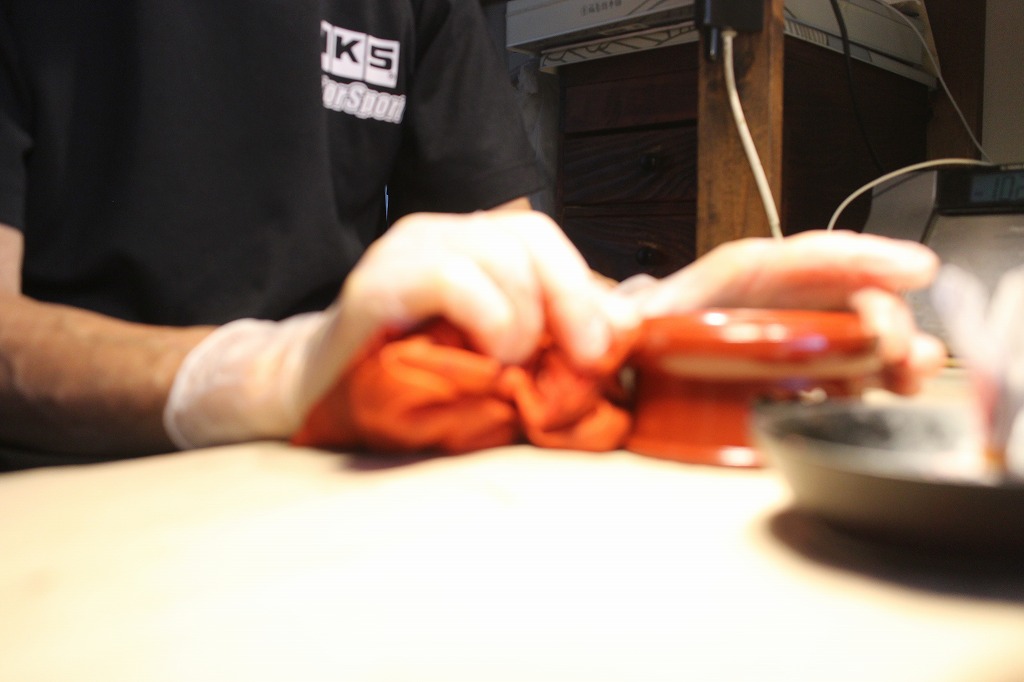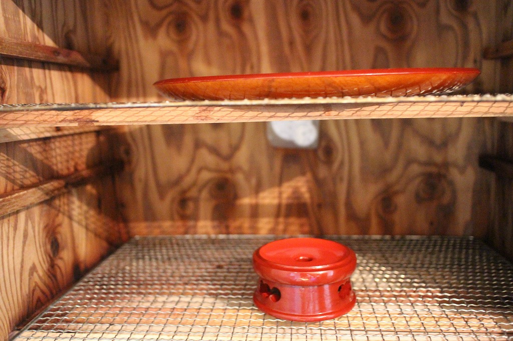 最終の塗りは練り赤口漆による拭き漆です(除く上面)⇒ 丁寧に拭き取って乾燥室へ。