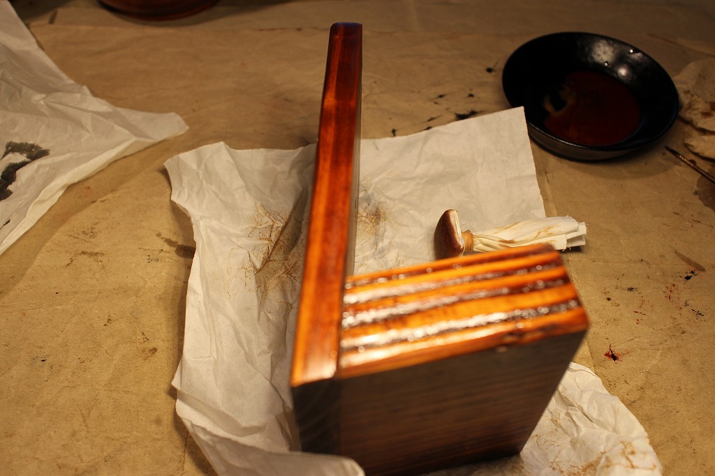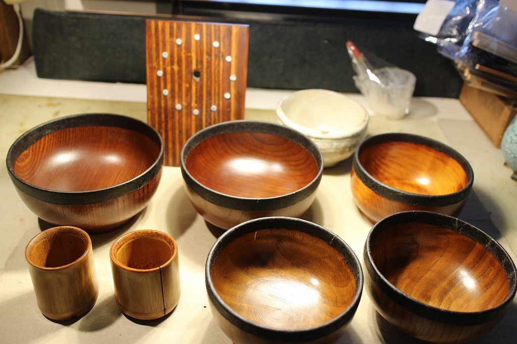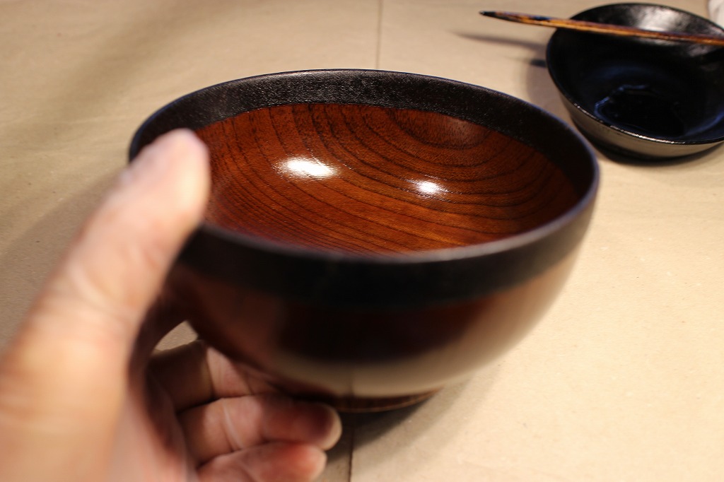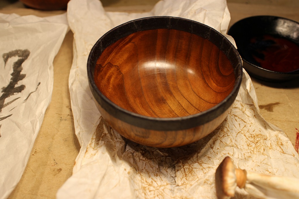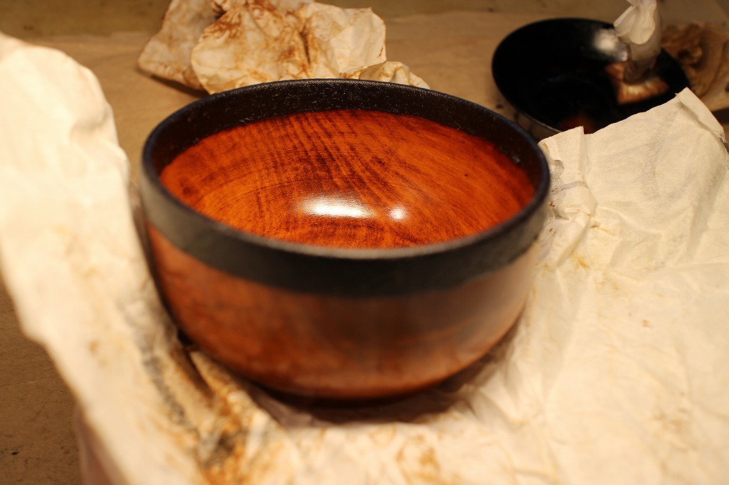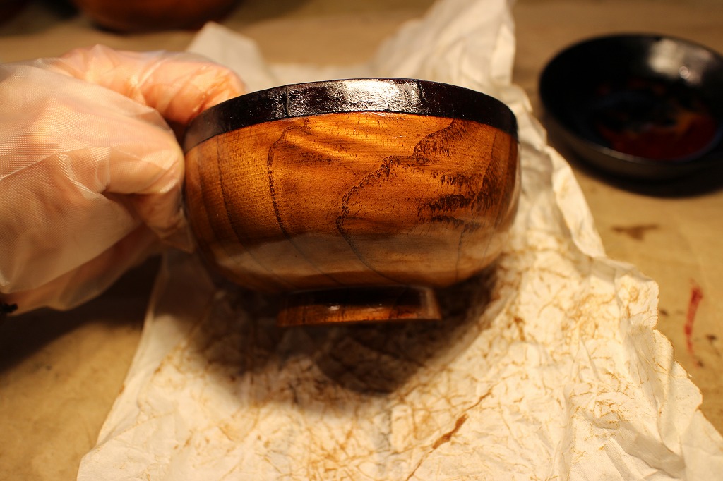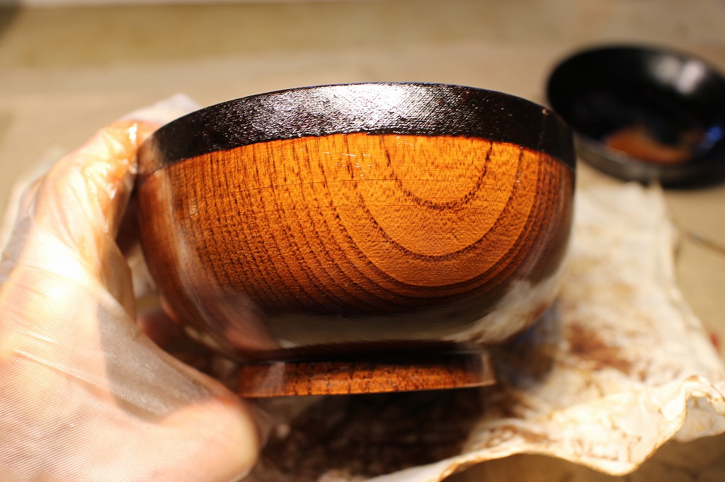 宿題その②。お椀の縁取り麻布張りの塗りは生漆で2度塗りしてから → 最終的に黒中漆を