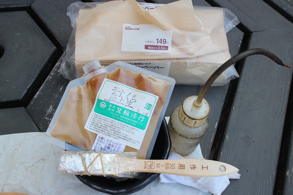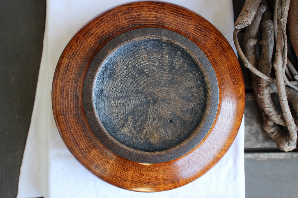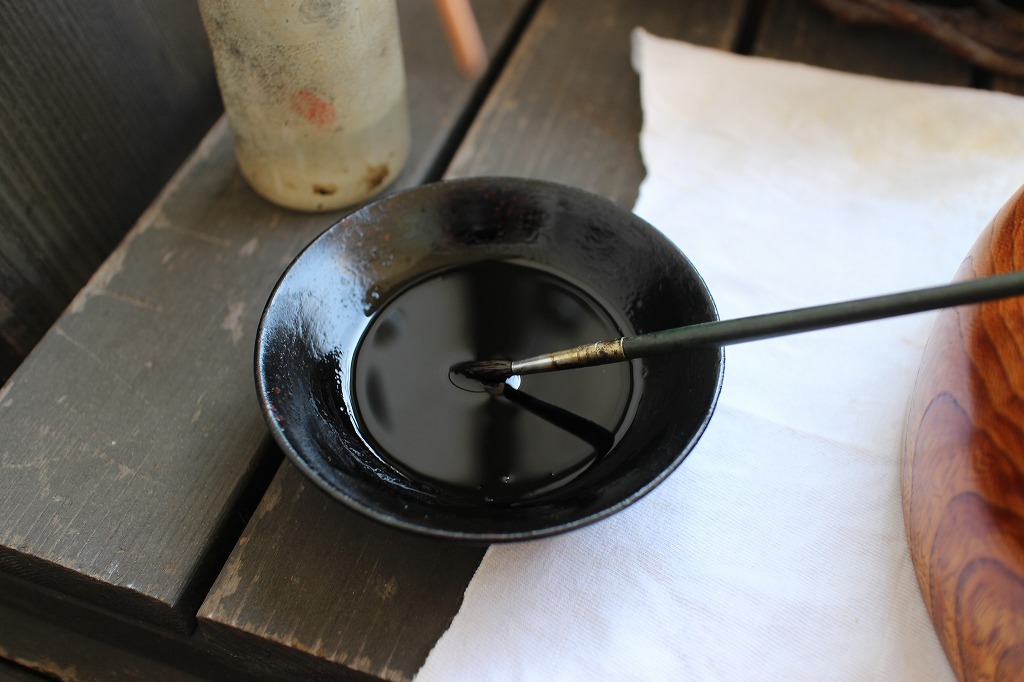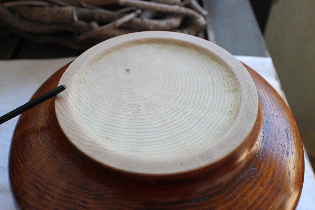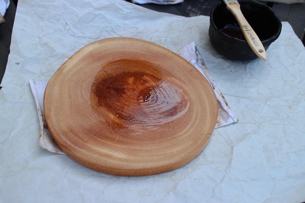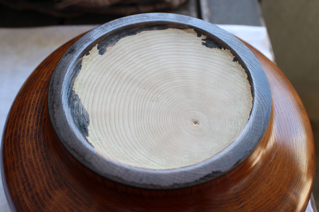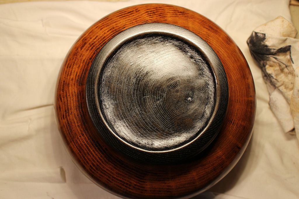 ①重た~い菓子鉢は高台部分を掬い取ったらアラが出てきました。年輪の中心に3mmΦくらいの孔が空きました。どうやらその部分だけ組織が緩かったようです。そこを埋めて2回目・3回目の黒中漆の拭き漆です。