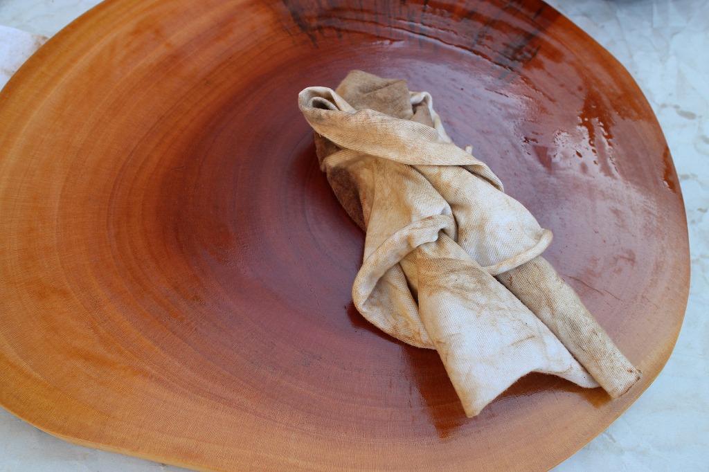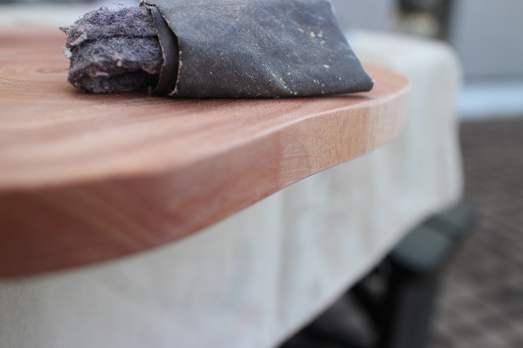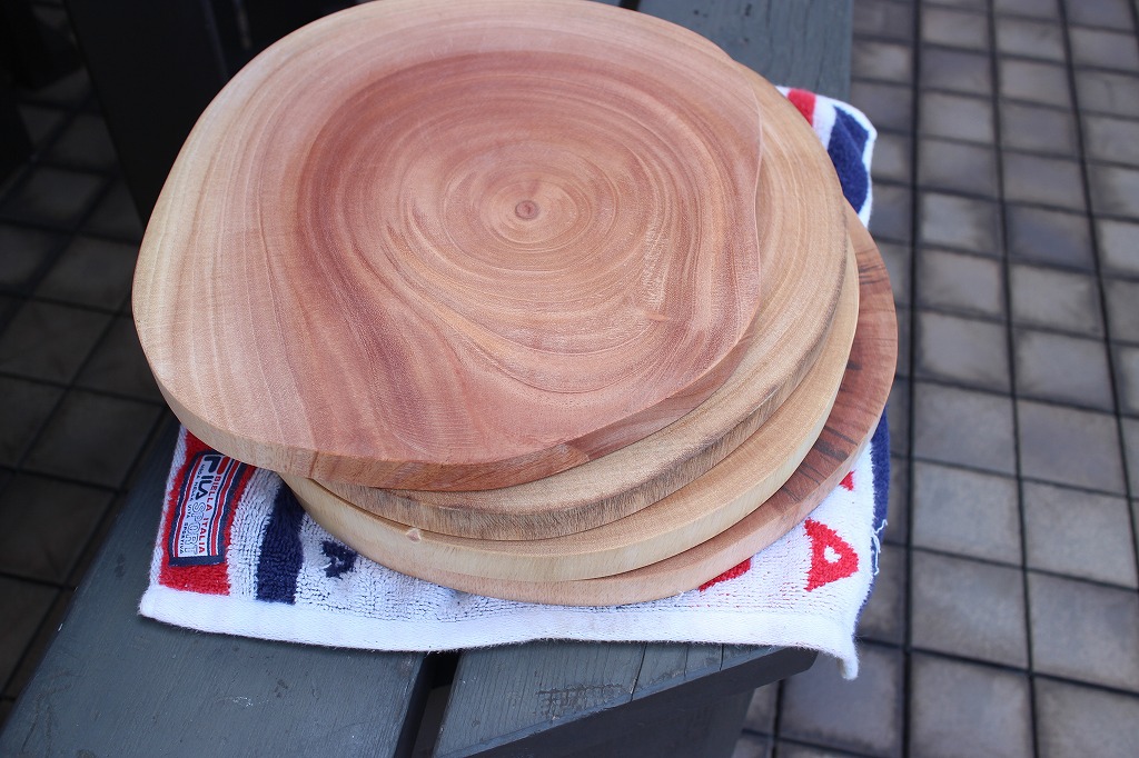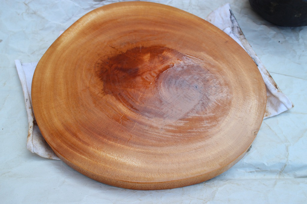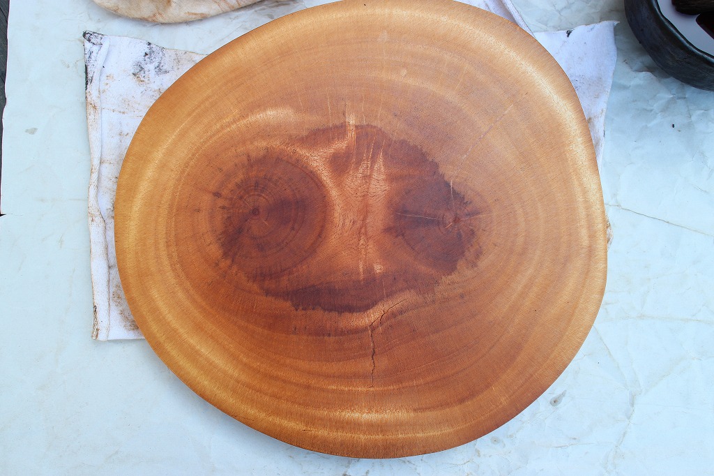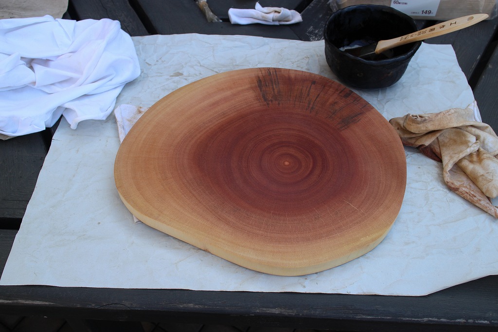 この↓マホガニーはアフリカ産のドライ・マホガニーです。良く乾いていて、輪切りにしては目下?割れがでていません。カッティングボードに丁度いい大きさと厚さです。角のエッジを落として⇒#400のペーパーで表面を整えます。塗りは、極上生漆を5倍に希釈して木地に良く浸み込ませます。