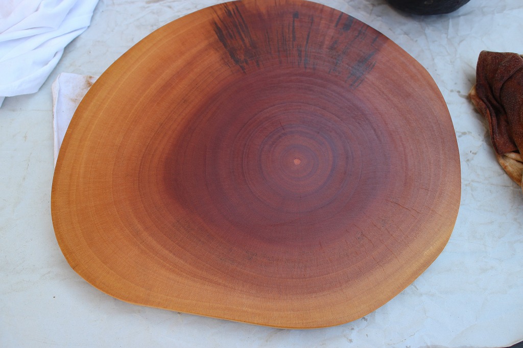 前回UPしたのはは2/21だったですかね~。どんどん投稿する間合いが長くなって焦ってます。てなわけで、今日は最近手掛けている重た~い菓子鉢の軽量化作戦(その2)と、新規にマホガニーの丸太切りの盛り皿orカッティングボードの塗りの過程をご紹介します。