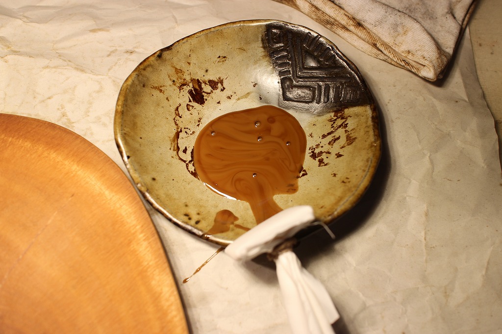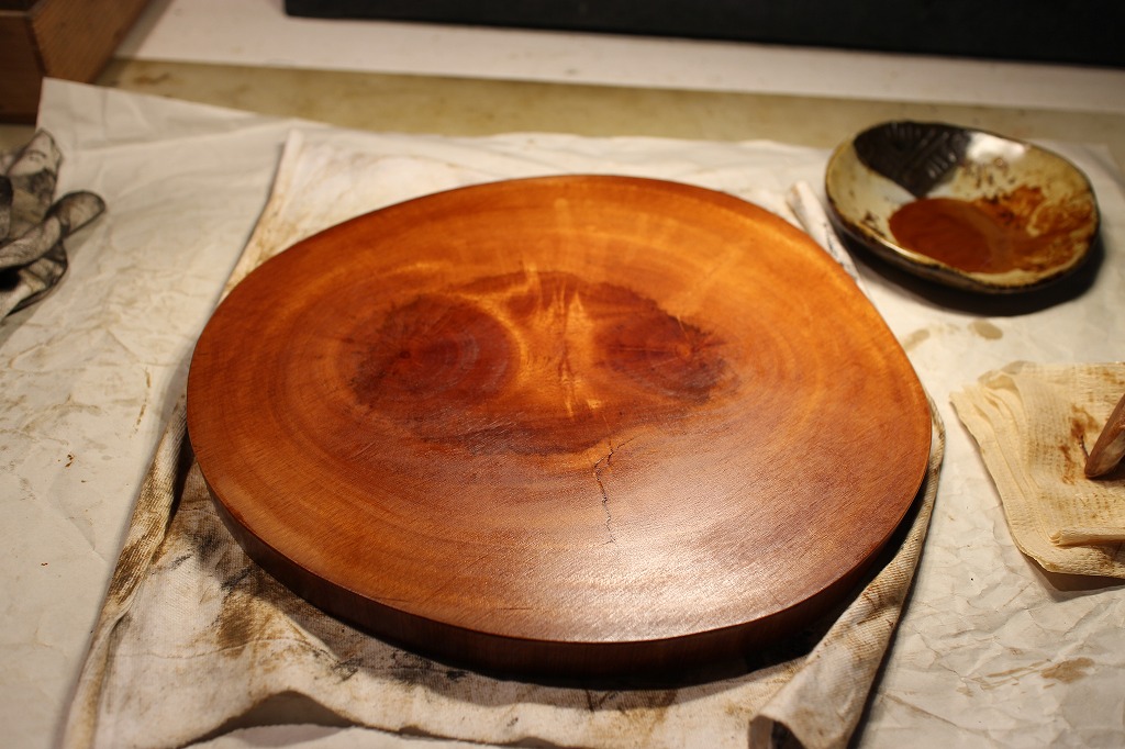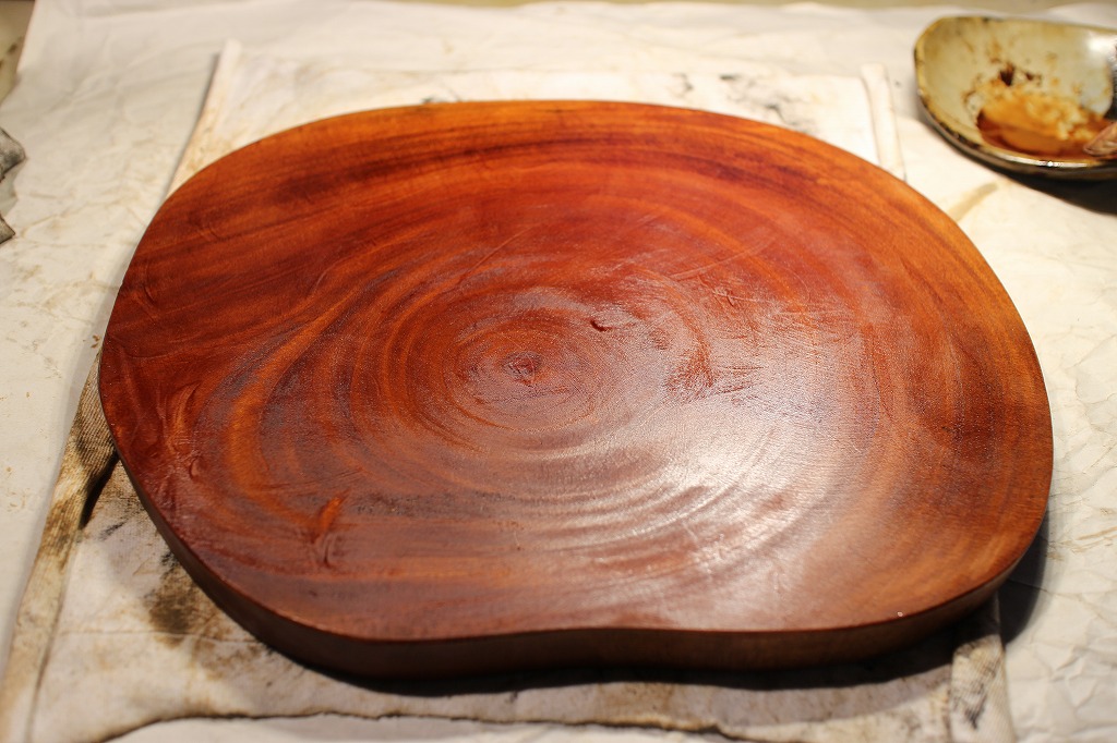 前編の木地固めでも紹介しましたが、硬い割には漆の吸収が良くて思った以上に深く入ってしまいました。今回はその上に生漆を拭いてみました。