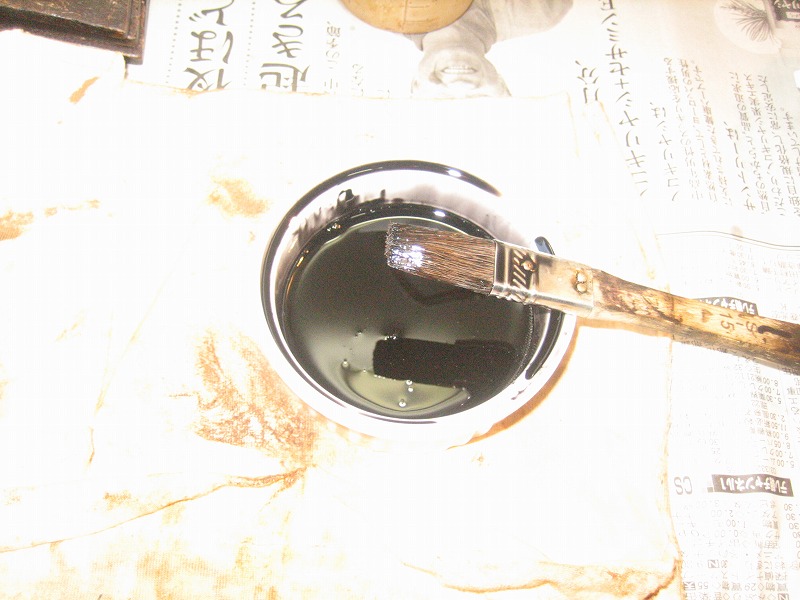 黒艶消し漆を木地固め用の割合に薄めて上塗りをしました。どんどん吸収されますが、相変わらず下地の浮いたところは白っぽく残ります。