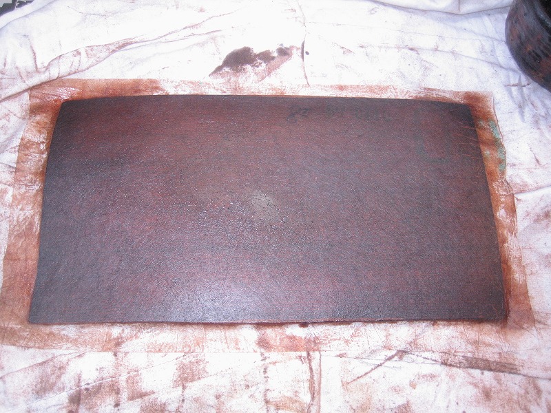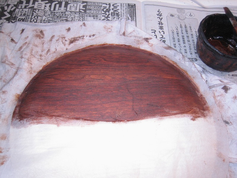 上右の画像から、手順を変えてみました。まず、漆を全面に薄く延ばして和紙を仮置きします。
