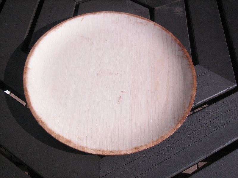 栓材の大皿は一見するとパーフェクトに見えますが、円周に近い折り返しの部分にポツリポツリとテカリがあります。これは、和紙が木地に密着していな部分、浮いているところです。