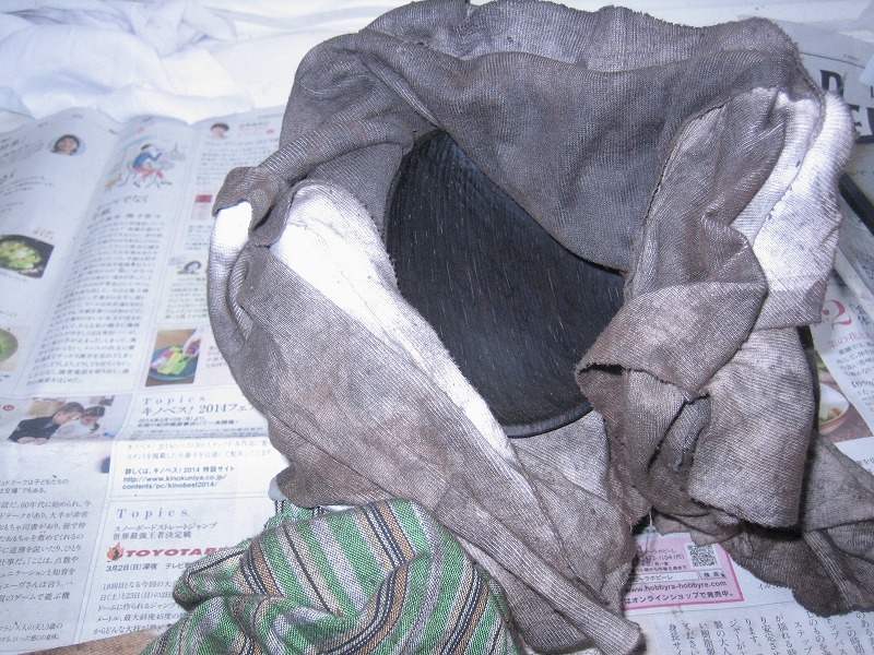 工房では、じっくりと錆び付けです。大量に生漆の錆び付け漆を作ってラップをかけます。(なるべく空気に触れないように。この段階では全部塗れる量かどうか読み切れていない)