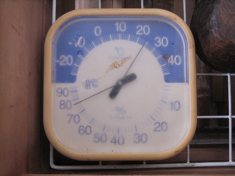 工房に到着してまず、温度湿度計の確認です。24℃/78%と上々です。木地固めも上出来です。蓋を開けてしばらくすると、この通り、湿度は部屋の湿度になじもうとしています。