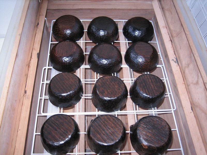 二日前に上塗りしたラオスの小鉢類は、手順を増やしたので今までと違う雰囲気です。