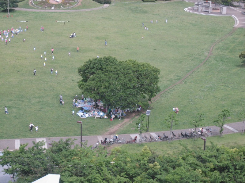 午前9時半の空。五月晴れとまではいかないものの、草原の中のシロツメクサと幼稚園児たち。