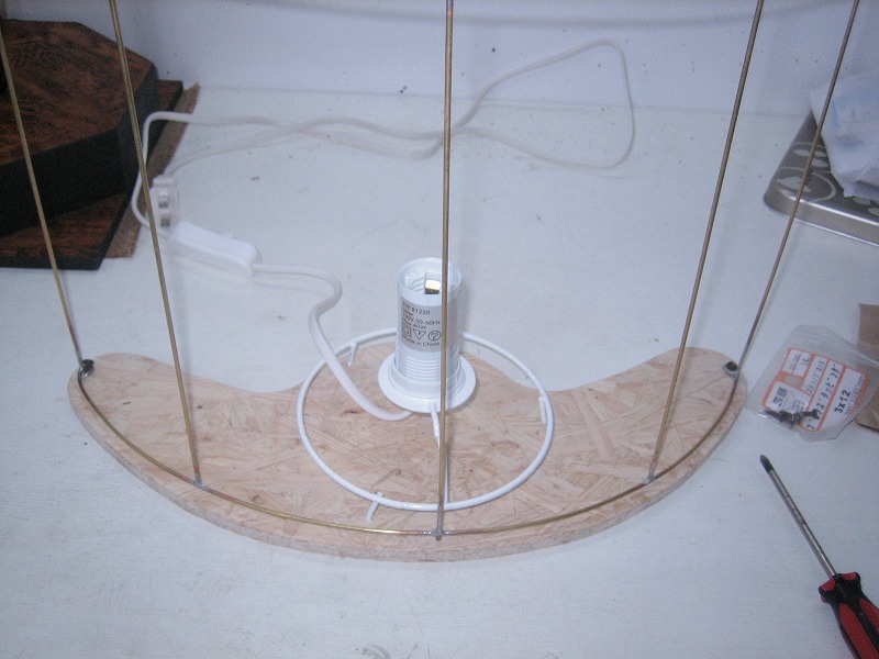 その後、新機軸の針金細工を少し・・。まず、金魚さんとソケットランプの取り付けに一工夫。