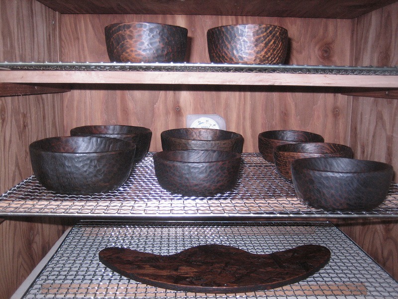 塗りは、ラオス松材の”たたき丼”と一緒に錆び付け漆です。