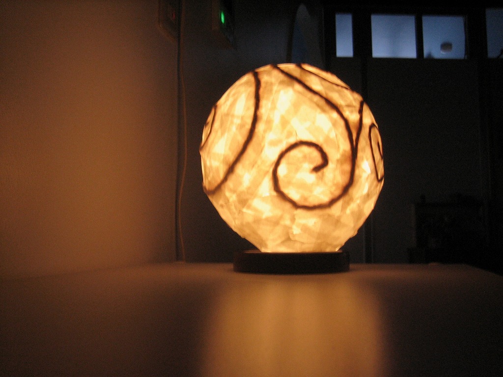 昨日作った天日干し台に猛暑日の天気が功を奏して、試作の”風船ランプ”の型が取れたので、早速、点灯式です。暗くしないと雰囲気が分からないので、ギャラリーの蛍光灯を消してやってみました。