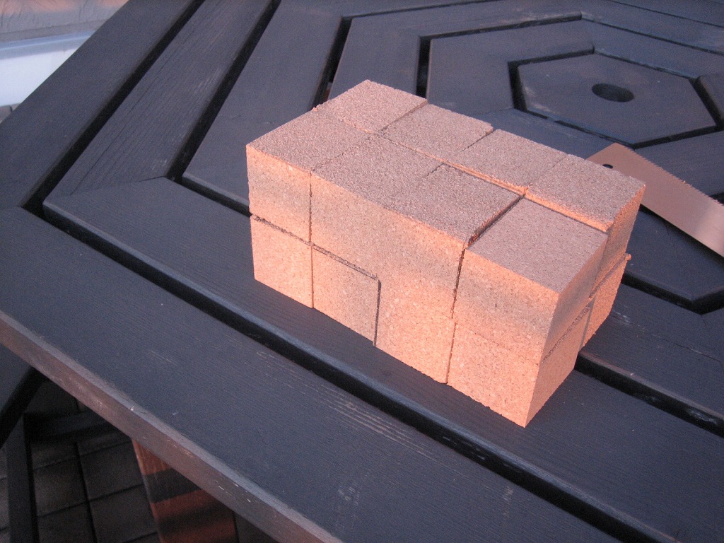 もうひとつVIVAでゲットしたのは、コルクのレンガ?。小粒のコルクがギュッと練り固められていて、かなり強度もあります。それを、5cm角のブロックに切り分けます。