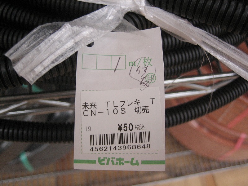 こんなに時間があることもめったにないので、そうだ!と思い出して、ビニールパイプを探し始めたら、いきなりテフロンのフレキシブルパイプを発見、”えっ、1m/48円!”即ゲット。