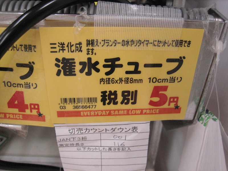 次に園芸コーナーをぶらぶらしていたら、潅水用チューブを発見、でも、径が小さすぎます。