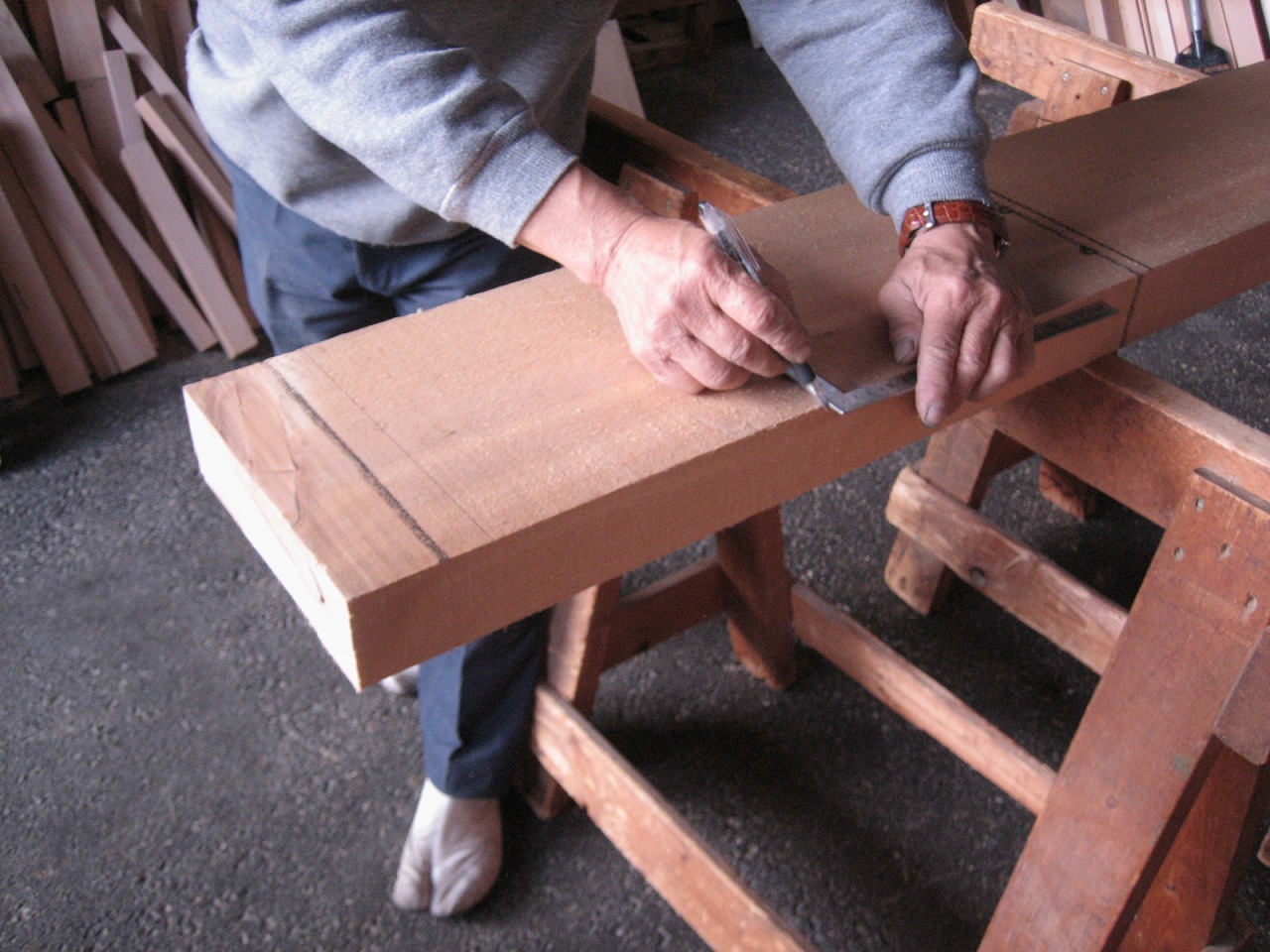 工場の中には、そのまな板を製作中のおじさんが、そのうち、親父さんがどこからか帰って来て、さっそくお願い事。その前に先日頂いた素材がこの通り変身しました!と写真で説明したら、”うちの子は良い子だ”とばかり大喜びでした。すぐに作業に取りかかってくれた次第。