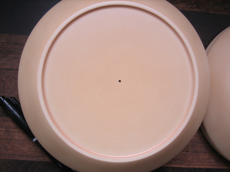 先日、合羽橋で手に入れた合成樹脂製のお皿を加工します。まずラベル類を剥がして、中心孔をマークします。
