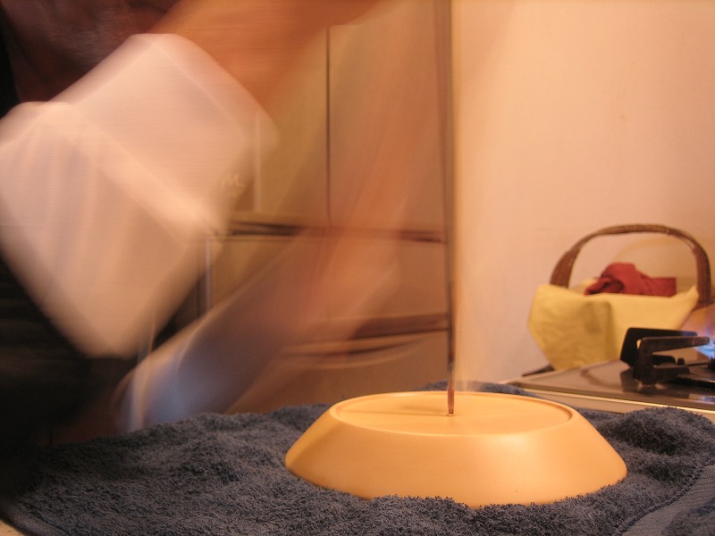 ガス火で天婦羅用の菜箸の先端を真っ赤にします。それを中心点に、ジュッ~と突き刺します。