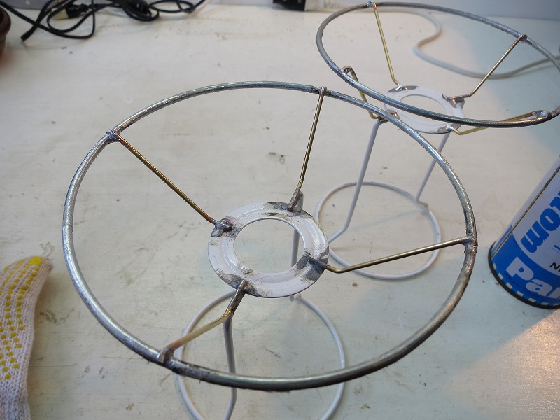 午前中は工房で雑仕事をこなします。ひとつ目は、ボトルランプに使用するスケルトンのお化粧です。まず、シンナーでむき出しの部分を拭いて油分を落とします。