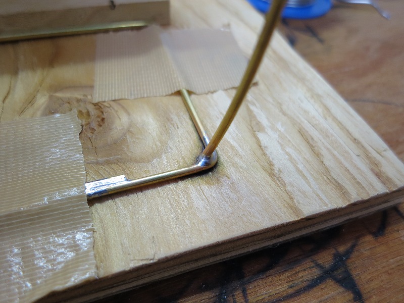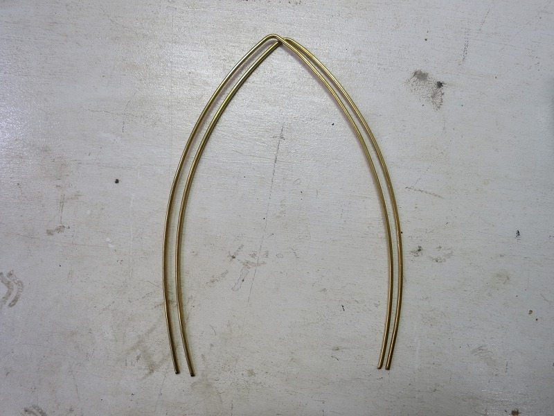 次に懸案のシェードの製作です。まず型板に沿わせてφ2mmの真鍮の針金を曲げます。