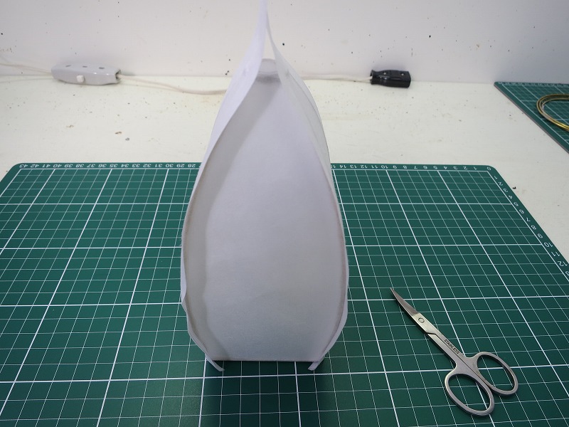 点灯試験です。和紙を貼ったら、鳥カゴというよりローマ法王のカンムリっぽくなりましたね。