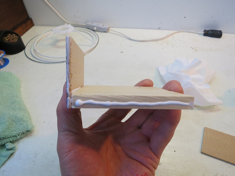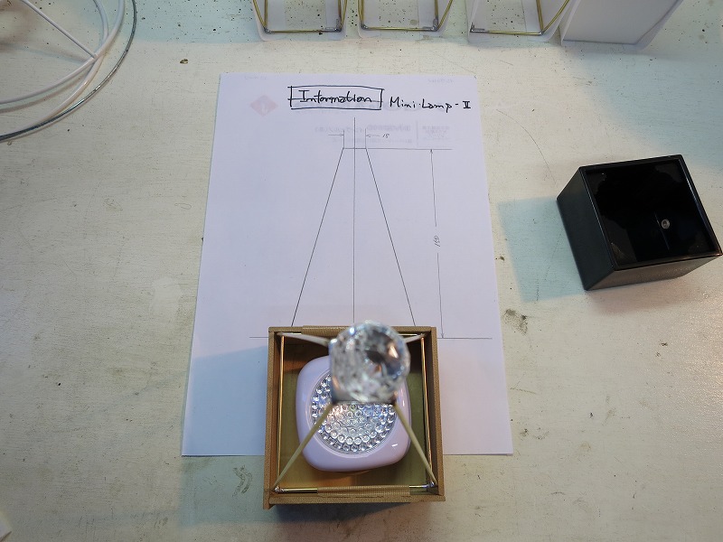 何用かというと、試作中のミニランプ、手がかかりすぎるので発想を転換してLEDのプッシュライトを使ったらどうなるか?実験です。箱は試験体なのでボンド付けです。