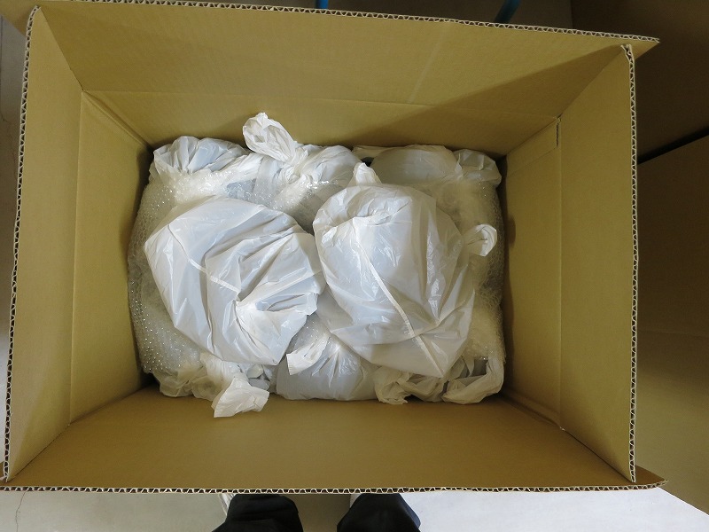 台座に電器器具のアッセンブリーを組み込んだもの、これを隣同士が傷が付かないように、大きめの買い物袋に入れて風船状態にして箱に詰めていきます。